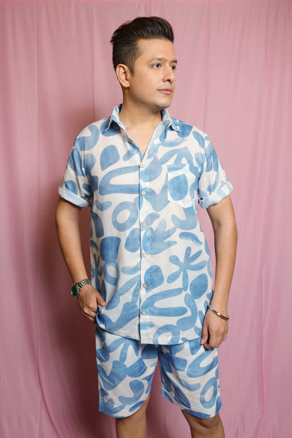This co-ord set is such a vibe. You can lounge in it for days and be super relaxed yet look cool. Paired here with shorts that on their own make a cool statement too. Pair with a basic tee.